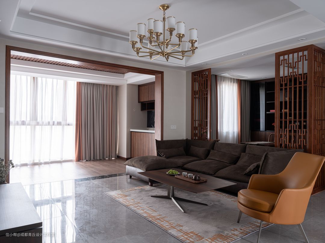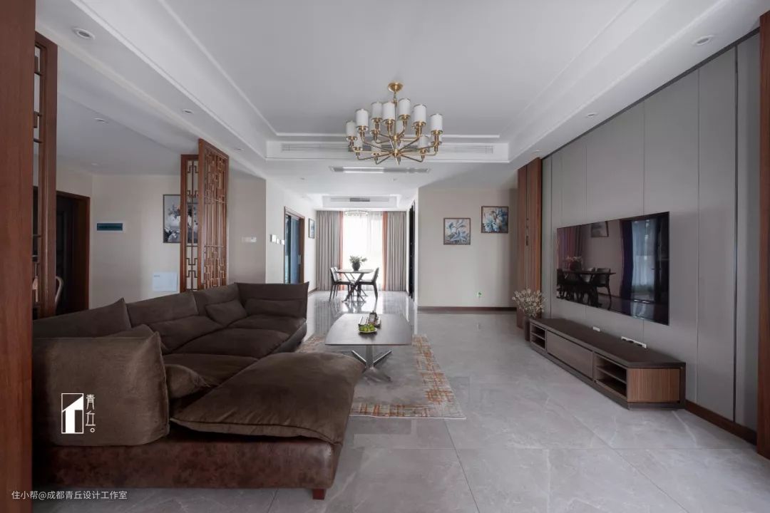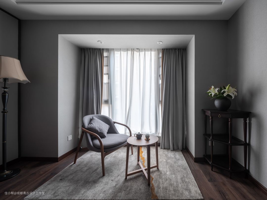 “先生爱藏酒,夫人爱诗画”,是形容本案业主夫妻俩的。所以你能猜到,他们的新家会装满各自喜欢的事。私下里,设计师经常称呼女主人是“文艺姐姐”,姐姐爱书法,爱品茶,所以重点设计了茶室,同时将整屋的基调,打造成了非常符合男女主人气质的新中式风格,“淡观山水闲看月,只念诗书不念愁”。