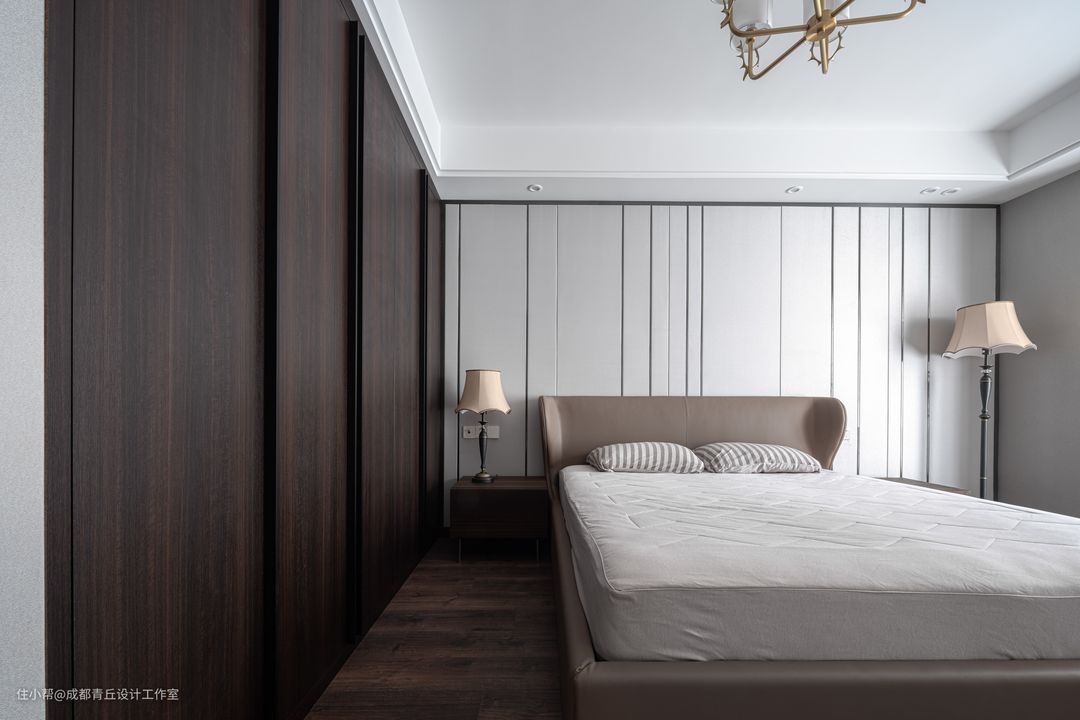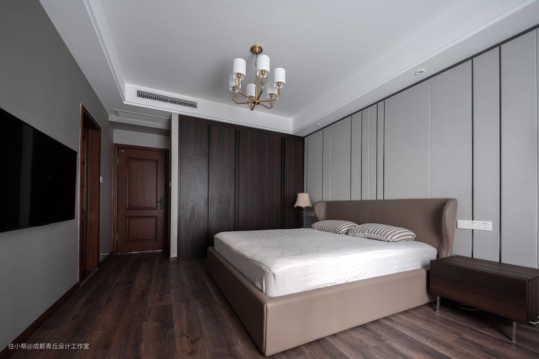 ■依然延续主题色调,主卧进门左手边靠墙定制一墙通顶衣柜,满足收纳需求。背景墙依然是客厅电视背景墙的使用元素,床中和了柜体和背景墙的色调,选择温和的奶咖色,手感细腻,三分之一人生长度的睡眠时间,不可将就。
