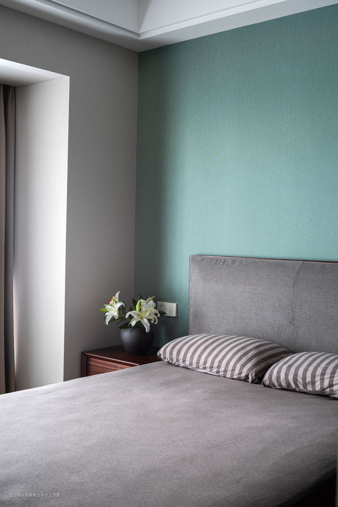 ■为出国留学的女儿准备的卧室,呈现了和主卧不一样的视感,背景墙是用清新的绿色墙布整贴,窗帘也选了同色调的绿,来达成呼应。