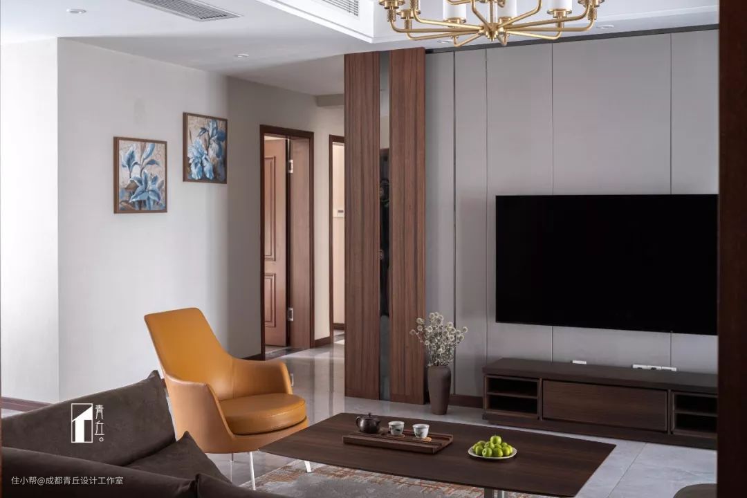 ■亮色的橙色单人椅,作为提亮单品,同时加持空间的高级感。宽敞的过道空间并没有浪费,为了强化储物,过道右侧打造了一面收纳柜。