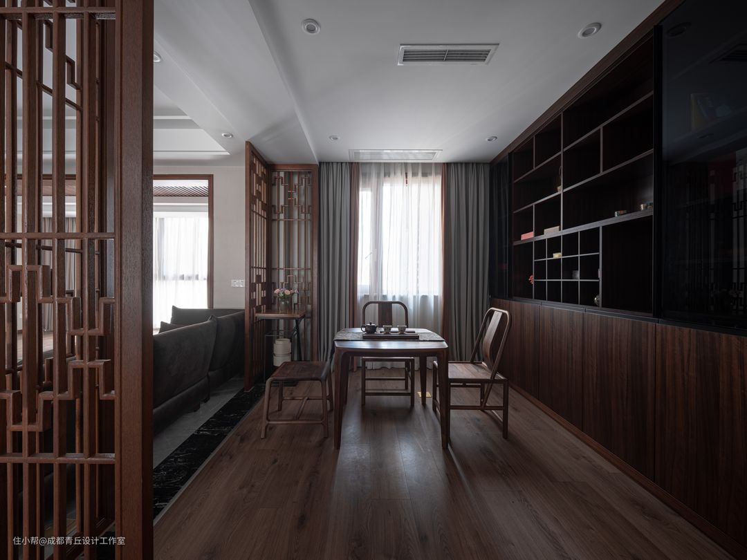 ■一面是日光,一面是茶香,茶室的设计大概是女主人最喜欢的部分之一了。中式气质的隔断、拿铁色木地板、开放式储物柜,于有形无形中创造出一份静谧而轻松的空间。