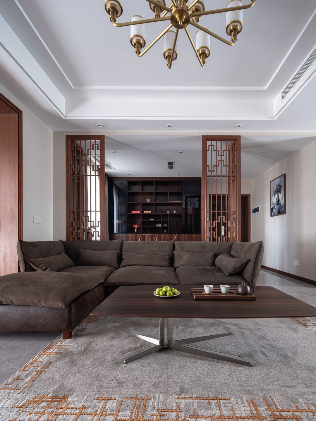■开放式的茶室,既满足兴趣归属,又保证家人情感交流畅通无阻。沙发、茶几和地毯一定是整个客厅强调主题的存在,稳重,个性,同时又很符合居住者使用习惯。