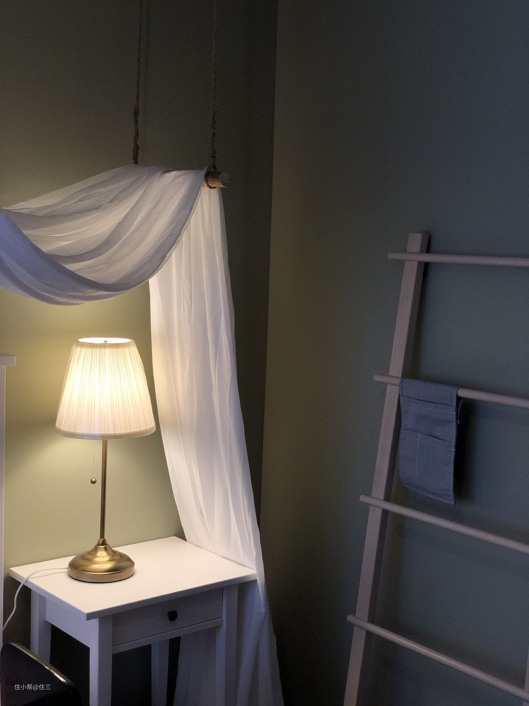 床头柜,金色小吊灯都是来自宜家的,纱幔的弧度特别美