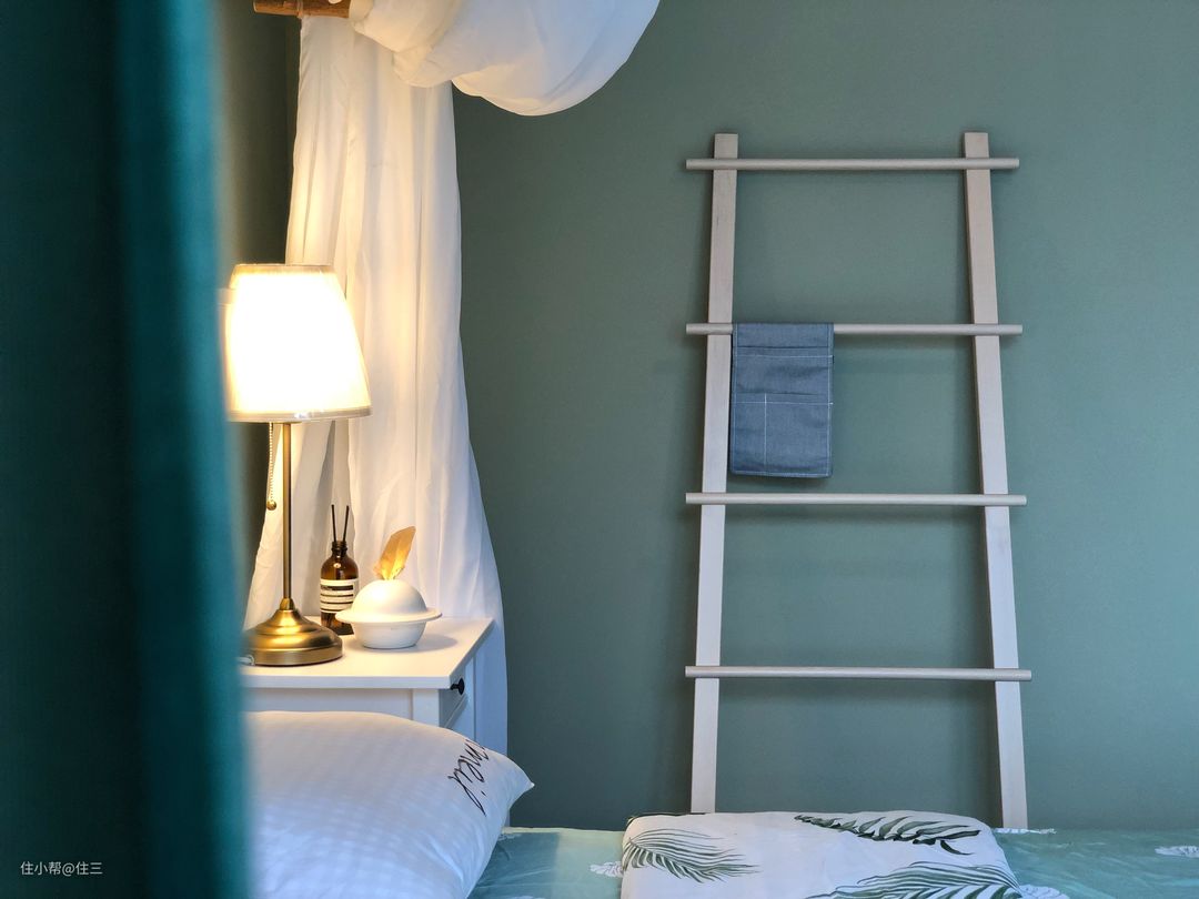 卧室打造的就是复古绿,也不想用多余的元素和装饰,添置了脏衣篓和挂衣架