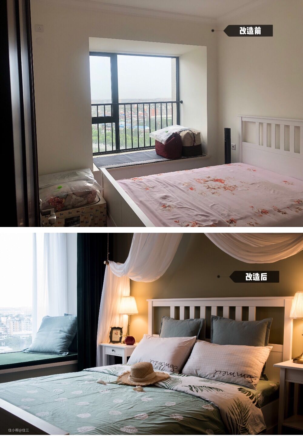 卧室改造前改造后的图片,可以看到其实什么都没有变,我们增加了床头的纱幔,增加了2组床头柜