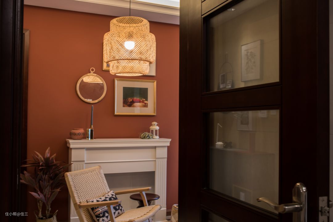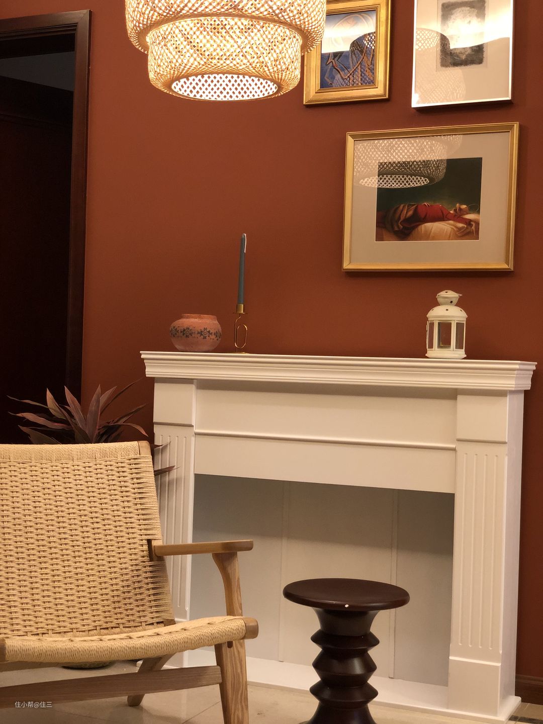 这个角度是站在厨房门口看美美的壁炉区,我们搭配了疼不的椅子和木质的墩子~藤编椅子坐感很舒服!