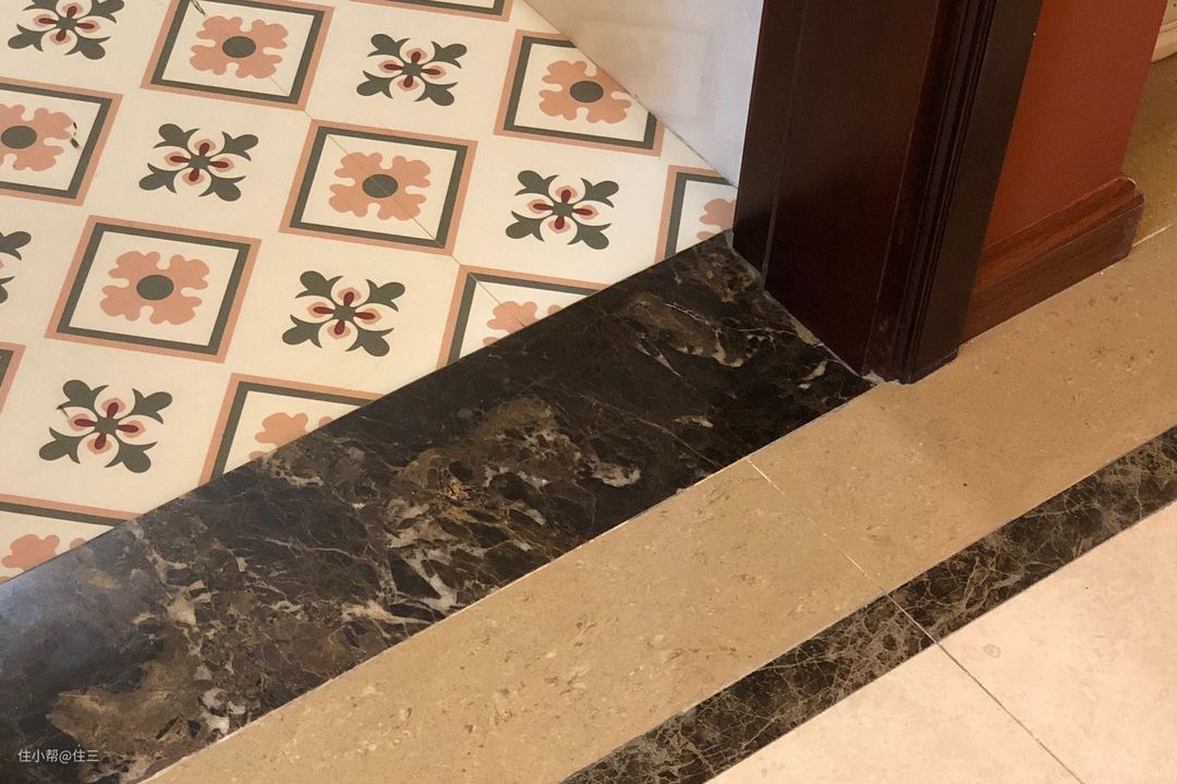 厨房就是前面有提到的硬装微调,原本我们计划是在砖缝处贴粘贴花砖,屋主姐姐喜欢很花的地面,所以我们就直接买了地砖贴整体贴了,跟屋外的空间还是很搭配的,值得!