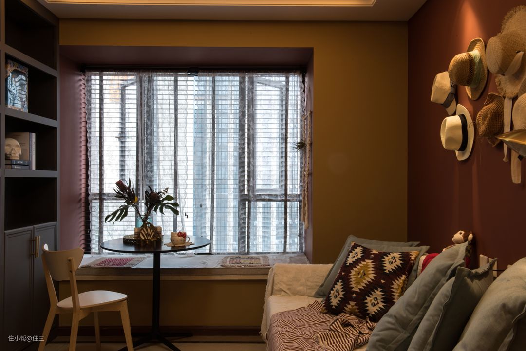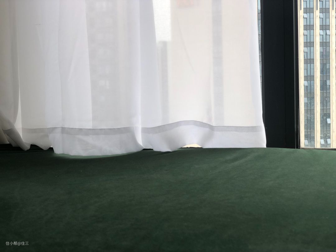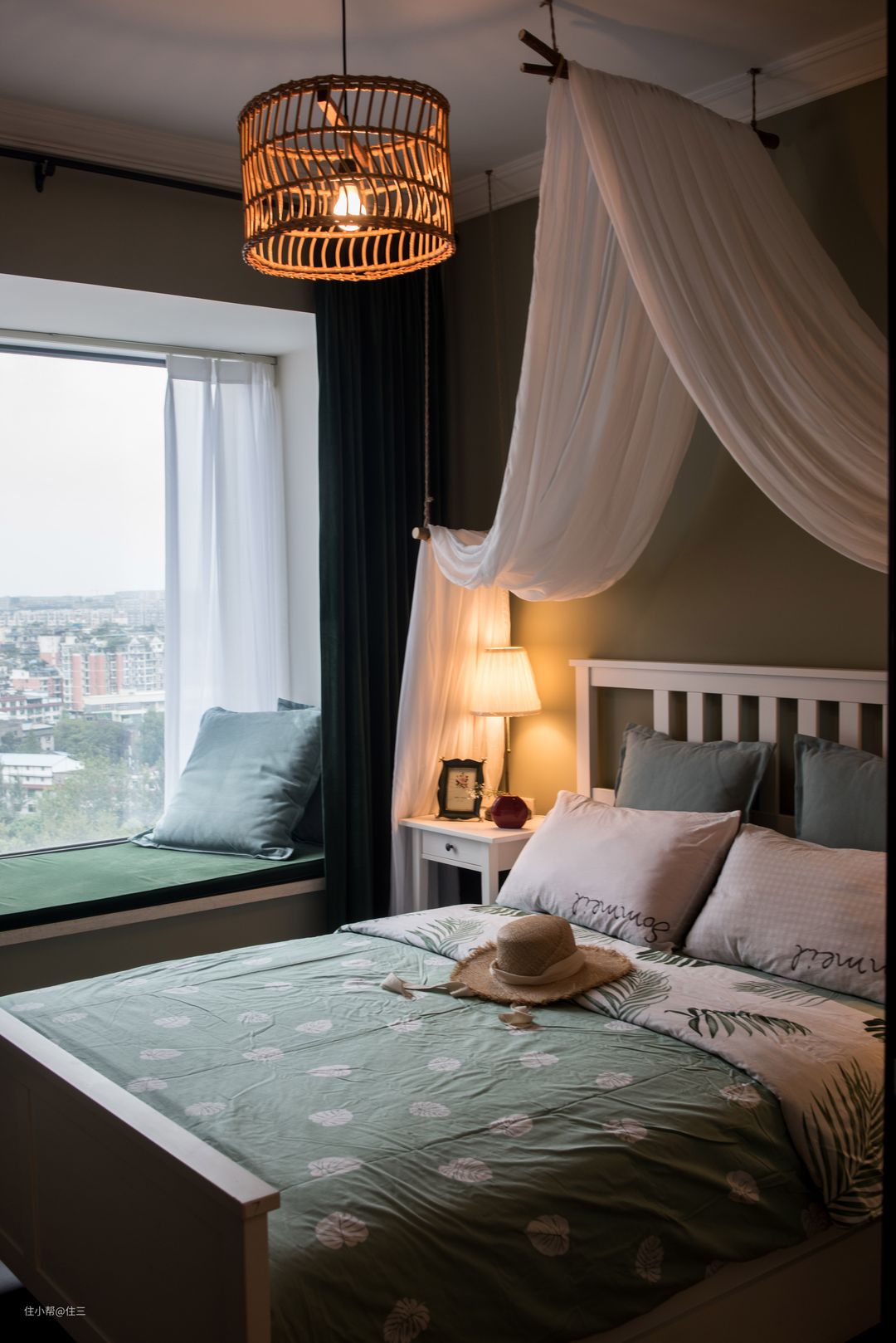 卧室的窗帘和飘窗垫都选了复古绿的绒布,质感和空间特别的搭配,柔软而宁静,让住客感受到客厅的热烈后可以在卧室来一个安静的沉淀~