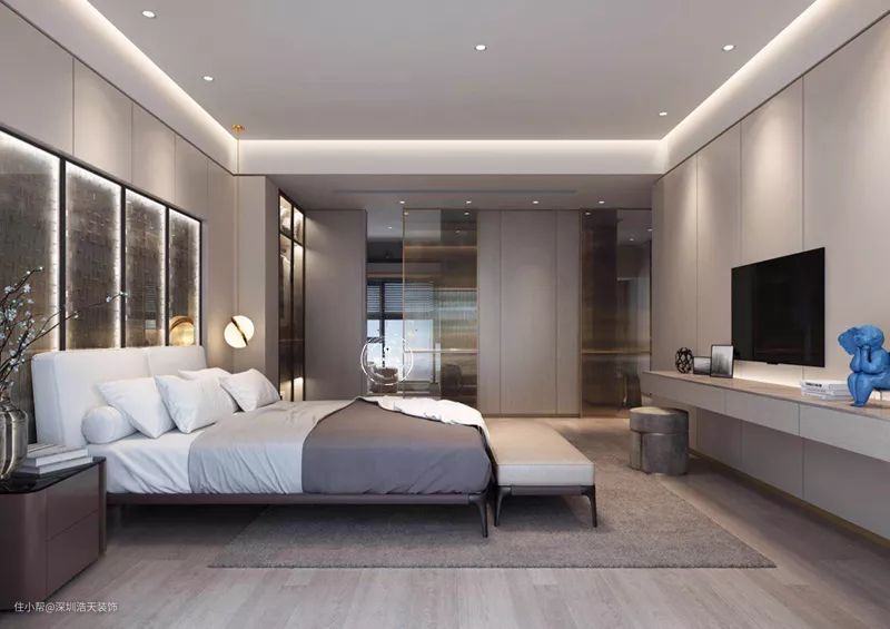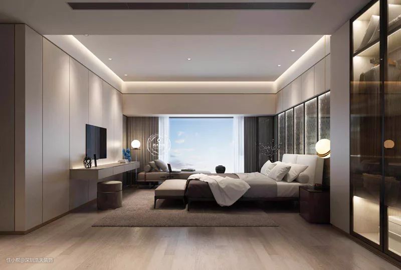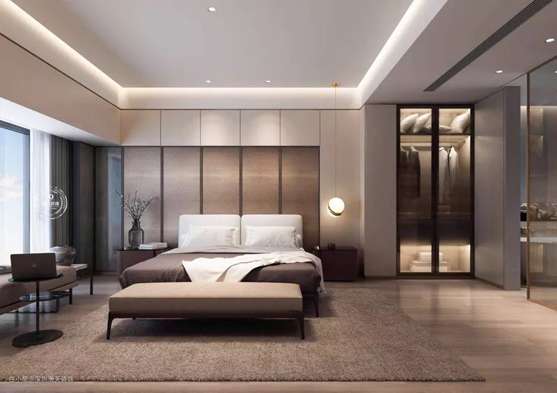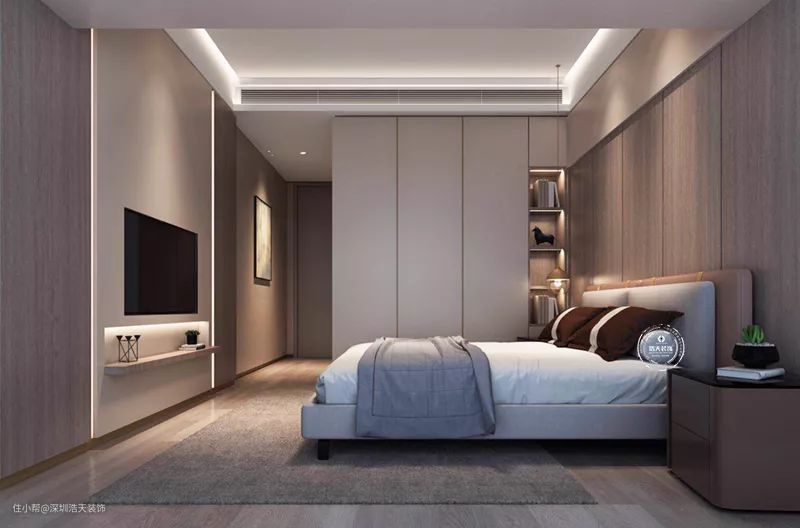 次卧空间相对舒适惬意的氛围,无主灯加暗藏灯带的设计,加之简单的床品,呈现出舒适优雅的档次气质。
