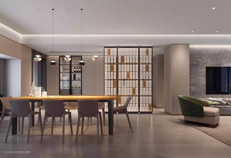 餐厅整体延续了客厅的轻奢简洁,中间布置一张金属质感的餐桌,创意的黑白吊灯,加以暖色的灯光,营造出一个时尚大方的空间感。通顶的屏风,成为整个空间的靓丽风景。