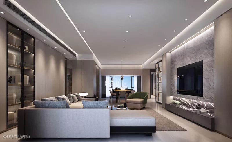 整个客餐厅以灰色地砖与布艺沙发基础,搭配黑色的线框装饰,呈现出一个高冷简约的空间感,显得年轻低奢又档次。电视柜为内嵌式,做出了地台的效果,在灰色纹路的大理石中嵌入电视机位置,显得简洁实用而又大气。