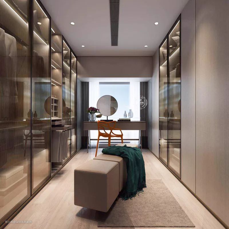 衣帽间的设计采用透明玻璃门,并在每一层设置灯带,既遮挡了灰尘方便衣物拿取又相应的装饰了空间。