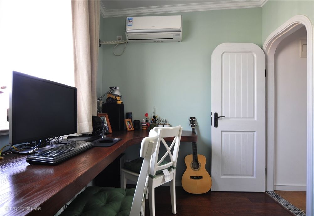 单独出来的书房兼电脑房,镶入式的夹层柜体,肉眼可见的储物功能,串联式的长方形桌子,功能区的运用舒适无比。