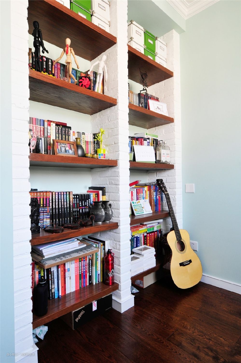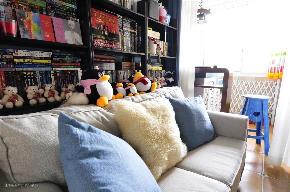 阳光正好,搭配了家里偏向于田园风格的装修,背后一排的柜体,各式各样的书籍小玩偶,小清新般的享受。