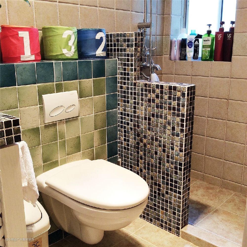 小片的瓷砖装饰,卫生间也是非常具有特色,半墙配置的淋浴区,有效的分离干湿区域,色彩上也是层次不断丰富无比。