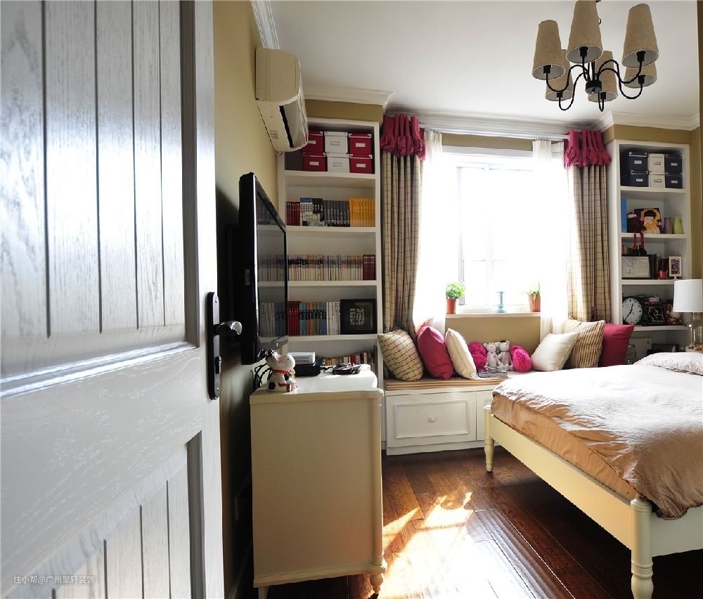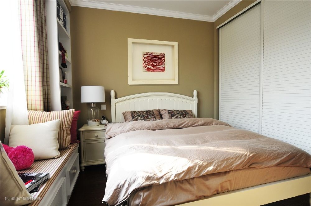 百叶窗的形状的衣柜,整体的卧室偏向于暖色调的搭配,设计的飘窗台,惬意的午后,休闲娱乐都是一件很好的享受。