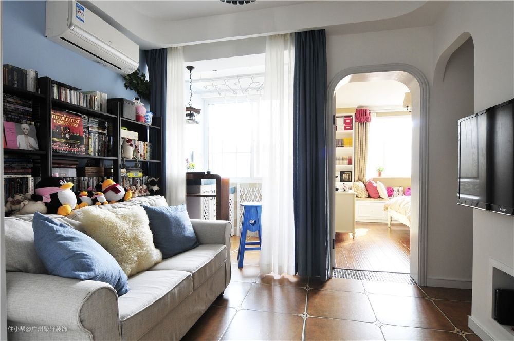 圆拱形的造型搭配,一字型的灰色沙发椅子,运用了代表性的朱褐色地砖,地中海风格带来的是对于色彩,线条,舒适程度的享受。