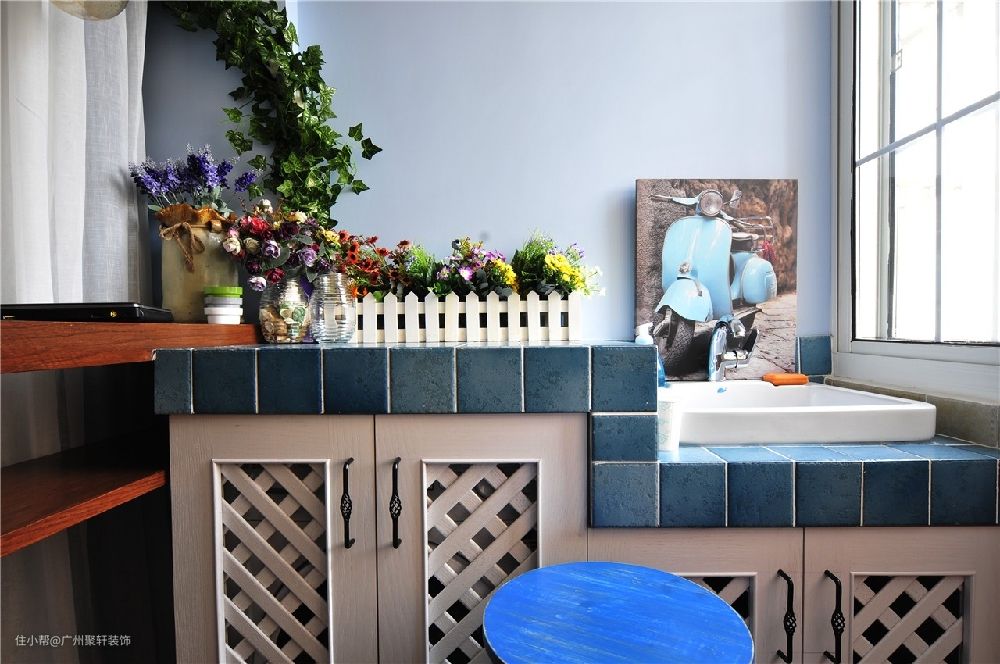 绿色植物的介入,让空间带有了呼吸功能,蔚蓝色的瓷片砖,属于家庭的小型花园台面,可谓是增添了不少色彩。