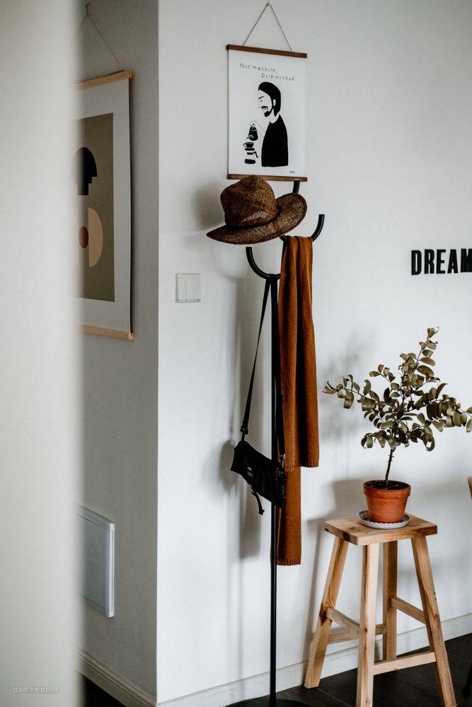 为何会在这个空间安置一个置物架?因为这边比较空,为了增加一点艺术氛围,就在淘宝上找到了舒梵家的这款置物架,可以放点艺术品,下面还可以挂衣服。如果把置物架抠掉,这个区域势必显得有点空荡。