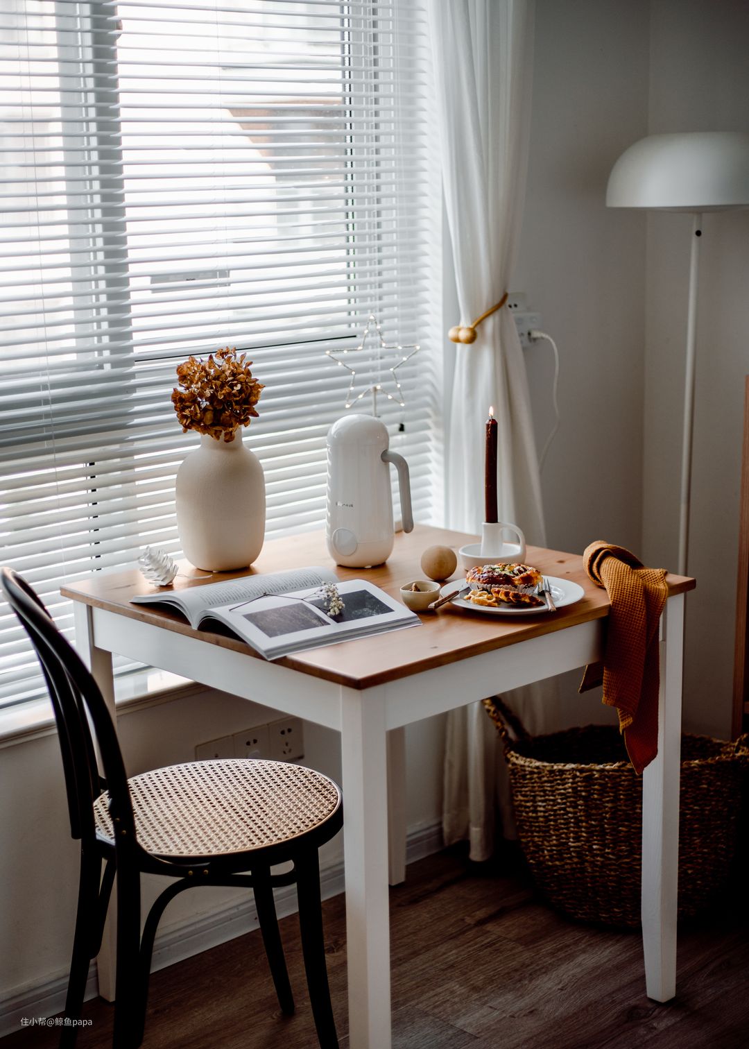 这是之前的长方形桌子,也不难看,就是不是很省空间。因为木纹桌面没有白色来的亮堂,就铺上白色的桌布提升整个空间亮度。