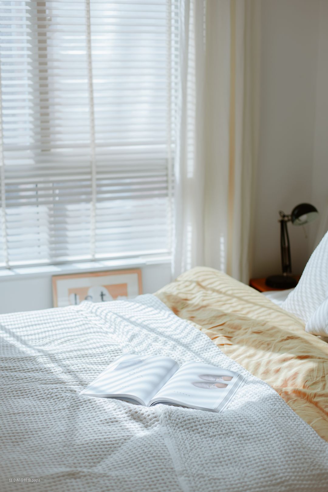 这是我家主卧,今年在主卧购入了宜家这款网红款斗柜,因为设计简单好看,三层抽屉能放不少衣服。在颜色上依然是坚持白色为主,木色为辅的风格。这两个颜色搭配在一起肯定不会丑的。纵观整个卧室的色调就是大面积的白色,小半面积的木色,点缀色是黑色金色。之前卧室里的窗帘是有遮光帘的特别厚重,卧室不大,窗帘拉到一边后容易堆叠,会堵在床头柜那边,特别难看,一气之下换成了这款白色布帘。这款窗帘比较透气透光,当风吹拂的时候特别好看,但就是不怎么遮光,喜欢晚起的朋友估计不能接受这种窗帘了。为了解决这个问题,我后来在阳台装了百叶窗来降低亮度。