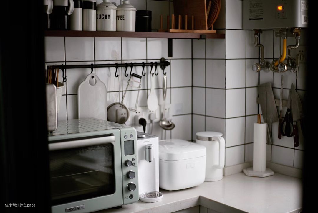 左手边烤箱煮饭区域,可以看见厨房是真的很小,所以烤箱上面都是用了置物架来收纳各种瓶瓶罐罐。刀架我买的是宜家可吸附的刀具架,所有的刀具都吸上了墙。整个台面也就大了一点。