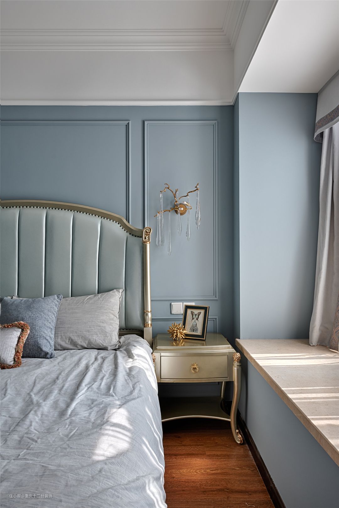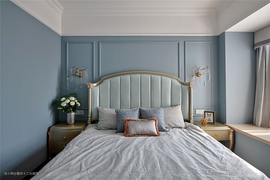 主卧色系走向是业主喜欢的的蓝色调,加上墙上的水晶壁灯,增加了一种精致感。