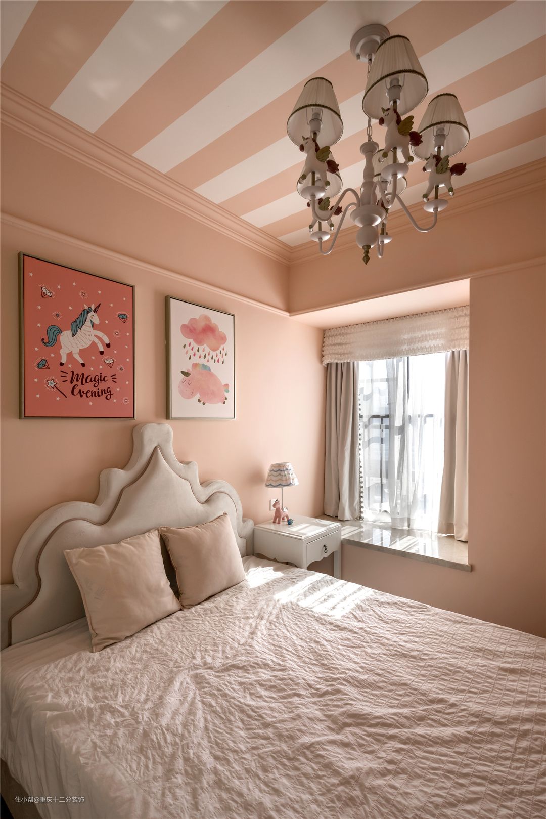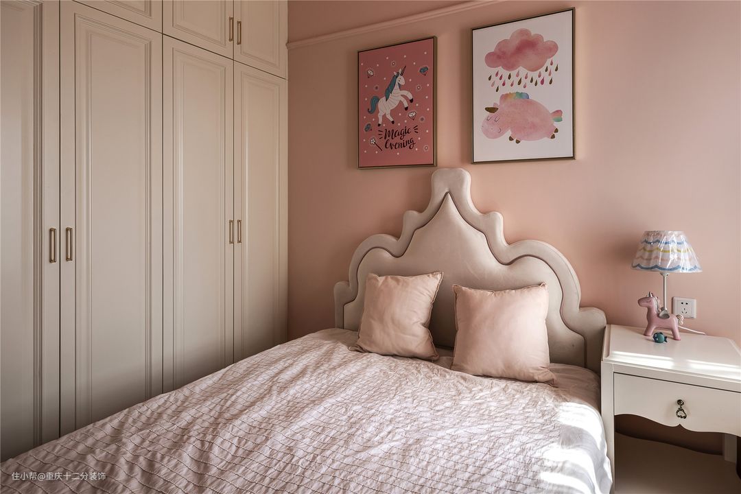 儿童房粉色调,因为业主一直强调,希望以后女儿回重庆住的时候有一个公主👸 房,所以在粉色的基础上,在顶面,设计师做了分色处理,使粉色的空间不再那么呆板,并且在吊灯,挂画,台灯上走了旋转木马的元素