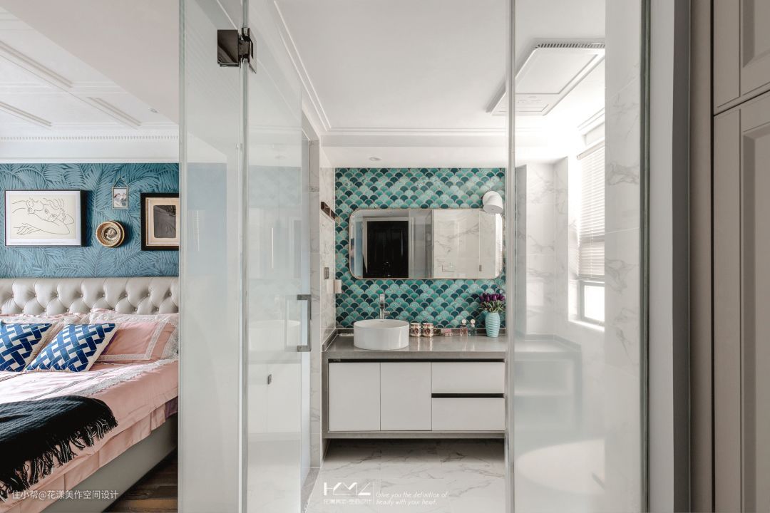 6、主卧取消了淋浴空间,利用渐变玻璃,一部分很好的保护了主人隐私,一部分又将主卫与主卧睡眠空间相合并,让主卧采光达到了最好的南北通透的状态。