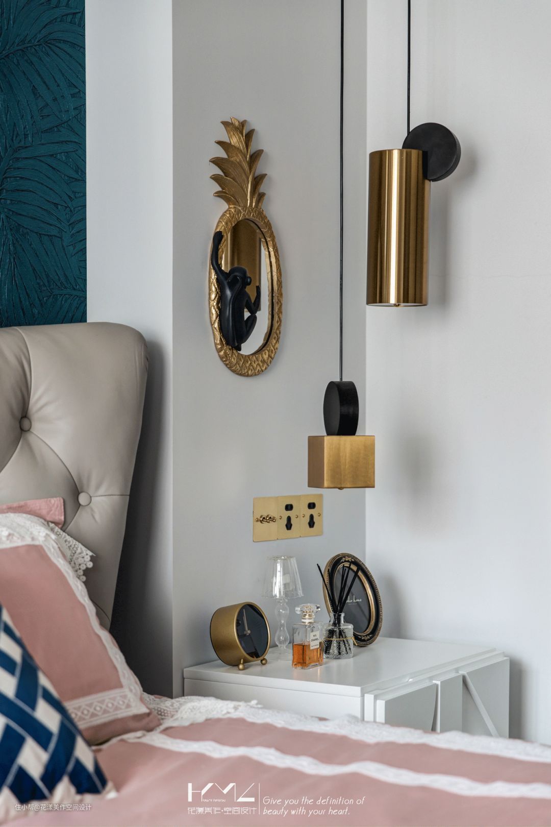 ▼错落不一的吊灯,结合墙壁上菠萝猴子造型的装饰镜,几何图案的白色床头柜,现代混搭的气氛悠然自得。