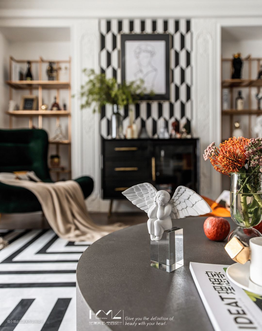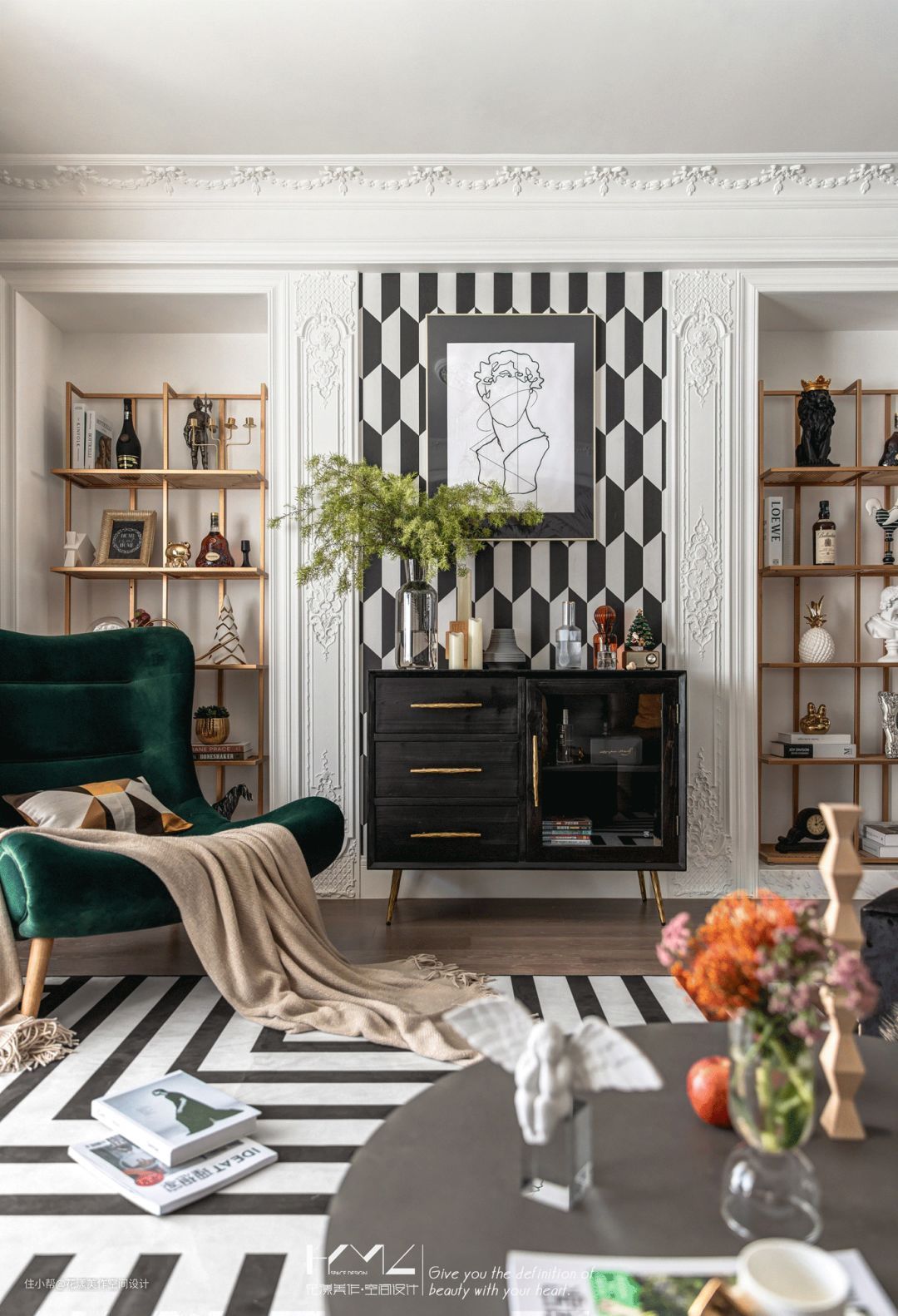 ▼中间是英国Cole&Son 进口墙纸几何图案 型号是:黑白色 105/12050,与黑白条纹的地毯琴瑟和鸣,中间的大卫简笔艺术画,香槟色的画框,提升了这面背景的艺术气息。黑色复古边柜沉稳不张扬,沉淀了客厅的摩登气质。