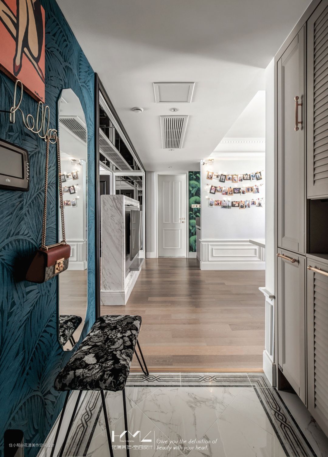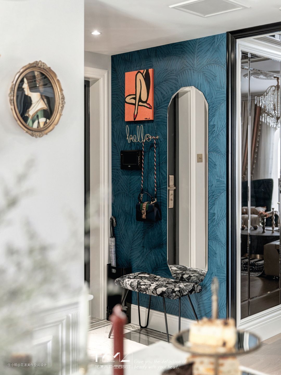 ▼开门入户,时尚混搭气息扑面而来,左手边是比利时arte进口墙纸,图纹是热带雨林的叶子,深蓝的静谧与凹凸有致的纹理搭配时尚跳色挂画,金色英文字母“hello”挂钩,右边棱角分明的全身镜,地面是经典法式花纹围边,右边扣线门板加百叶门板的组合配上精致复古的把手,野兽派独特花纹的细腿长凳,每一个细节都将精美质感伶俐体现,一个时尚复古的混搭之家,就这样映入眼帘……