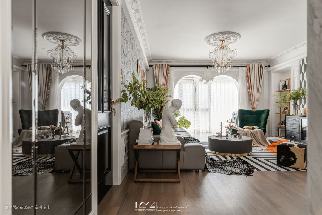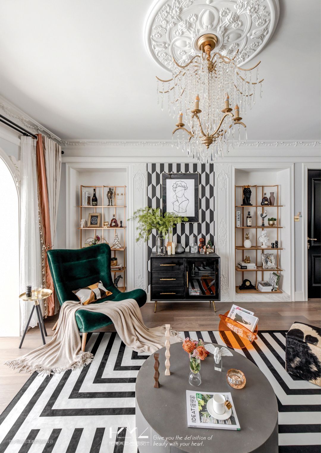 ▼客厅空间的整体氛围相对于餐厅,更显沉稳,色调以灰白黑为主,沙发选用了浅暖灰色皮质沙发,造型现代干练,材质经久耐用,局部软装进行跳色搭配,暖橙与墨绿在抱枕、窗帘、单人绒布沙发、亚克力杂志架以及装饰画上交相辉映,在这现代法式的基调上融入了新鲜活力,造型古典优美的水晶吊灯,仿佛一个典雅的公主,扭动着她那婀娜的身姿,剔透柔美。