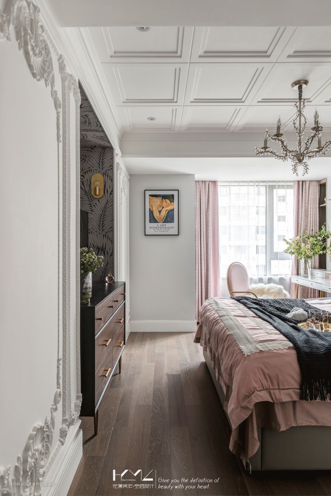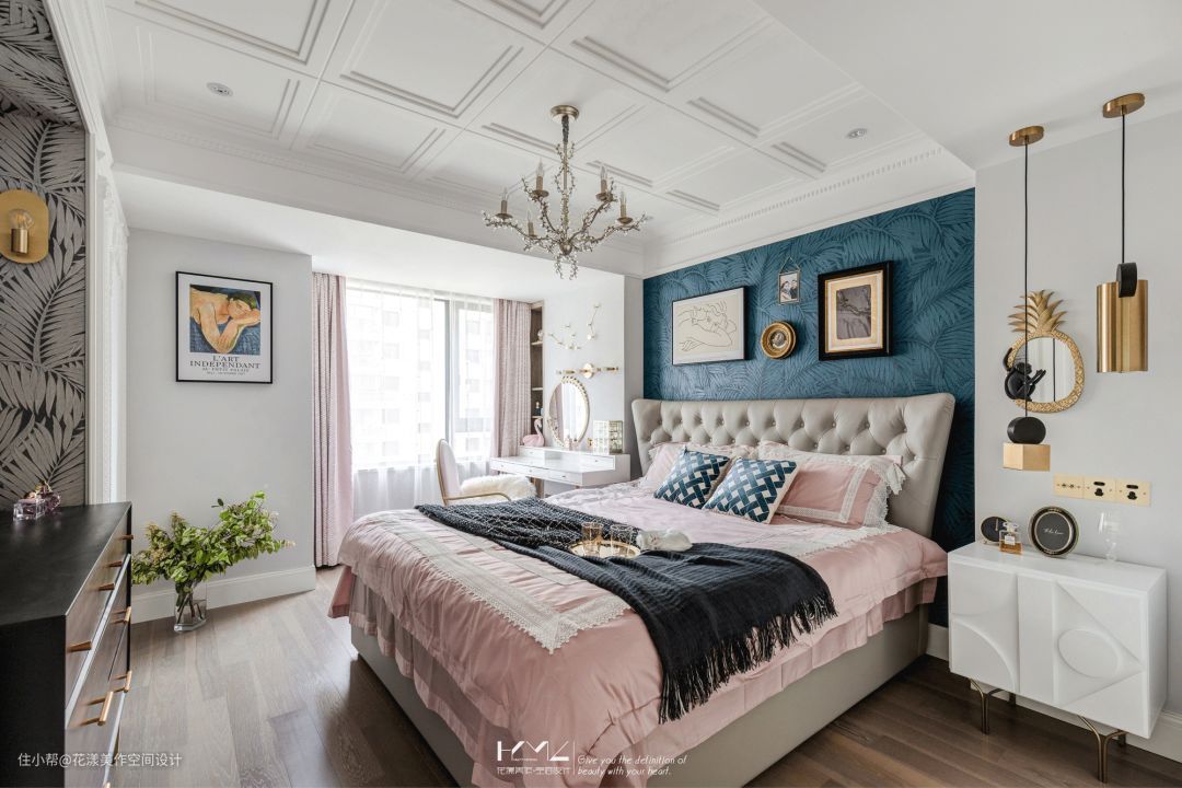 ▼主卧室,初始的设计是明亮色系的,在后期的软装方案中,我们方向发生了转变,也是想更贴合客厅的整体精致氛围,女业主的心里一直有个公主梦,她喜欢粉色和blingbling质感的饰品,所以我们后期混合了粉色系和金属质感的家具,复古水晶吊灯,吊顶的凹凸叠级,则是融入了法式宫殿情怀,让每个细节都精致有度的展现我们业主的喜好。