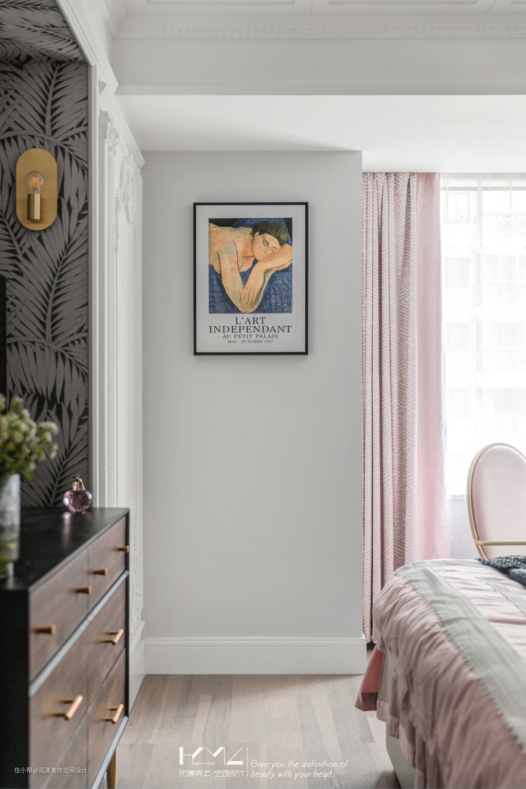 ▼床背景内嵌的壁纸,则与入户玄关呼应了起来,床头组合画有现代抽象的,也有复古精致的,还有业主自己的照片与金属挂框进行组合搭配,用心而又独特。