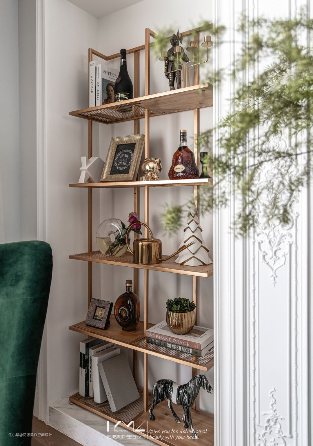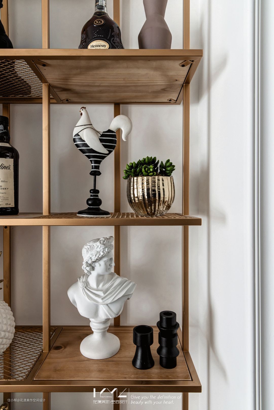 ▼与主卧相连的这道墙进行了凹凸组合,凹进去的空间,正好抬高做两个内嵌壁龛,放置金属展架,业主很多心爱的小摆件,和出去旅游淘回来的软装,名品酒水,组合成列,也成为客厅的一道独特的风景线。