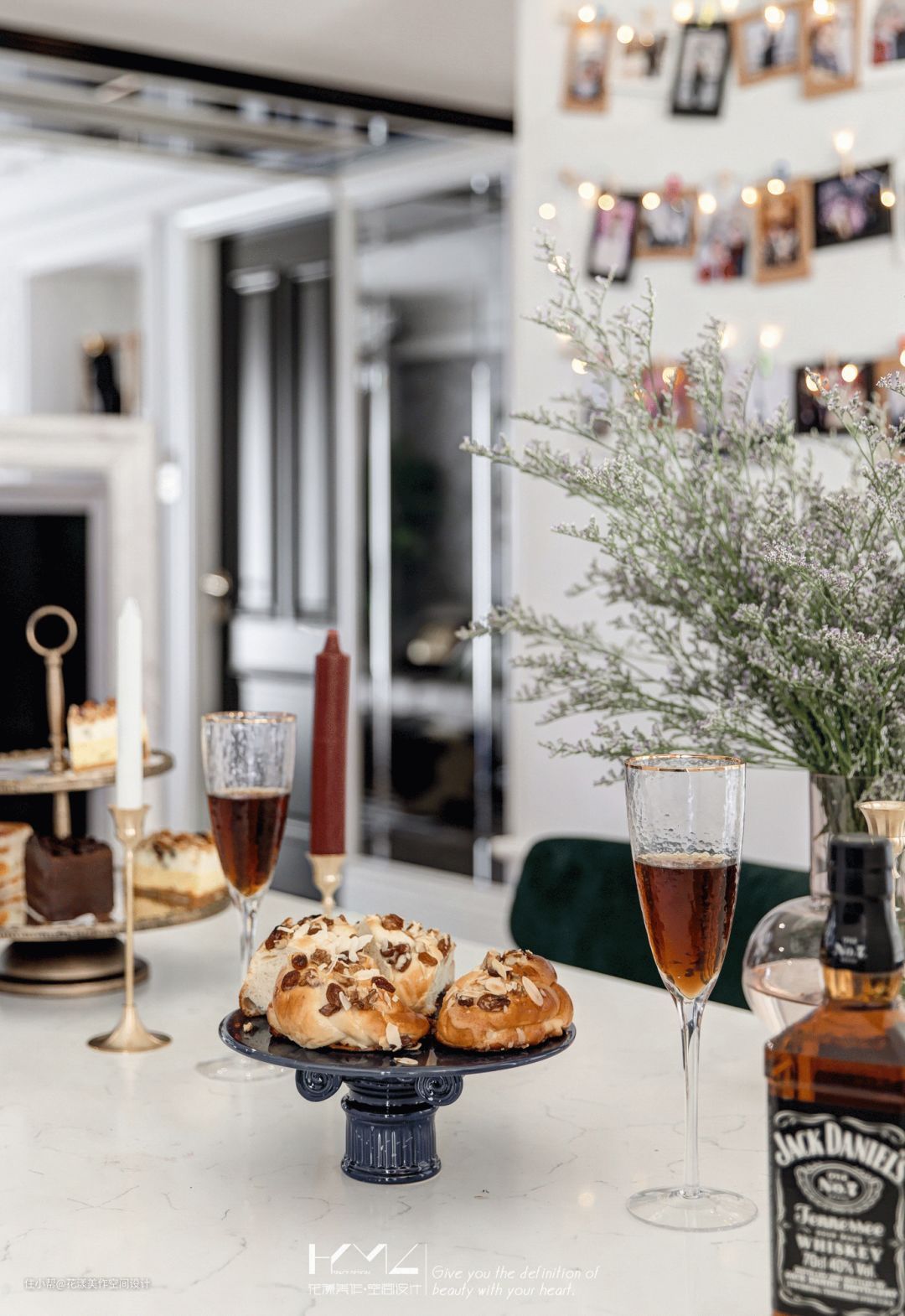 高餐台,搭配了祖母绿+豆沙红两支不同色彩的高椅,朋友聚餐时,这里就是吧台。