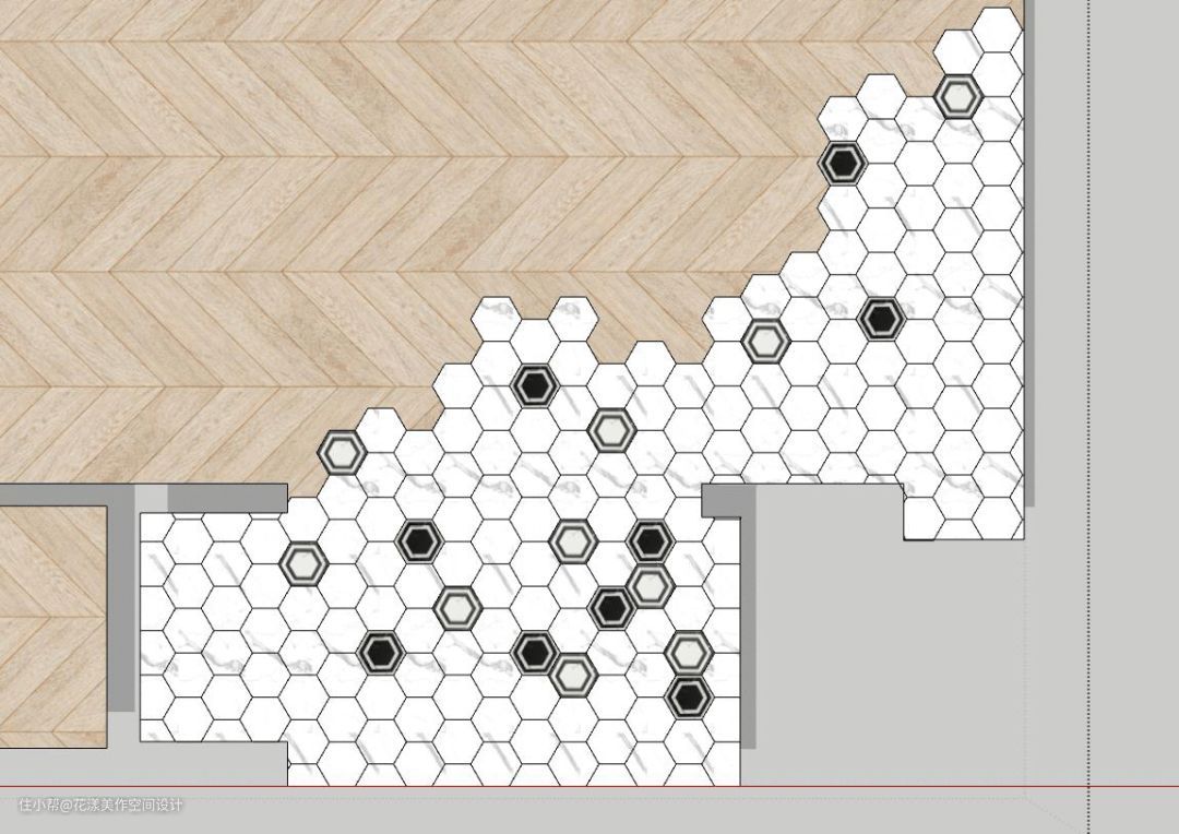▼地面选用了六角砖,大面的爵士白花纹,局部点缀黑色和黑沟边六角砖混搭,与门框的餐厅地板自然衔接。
