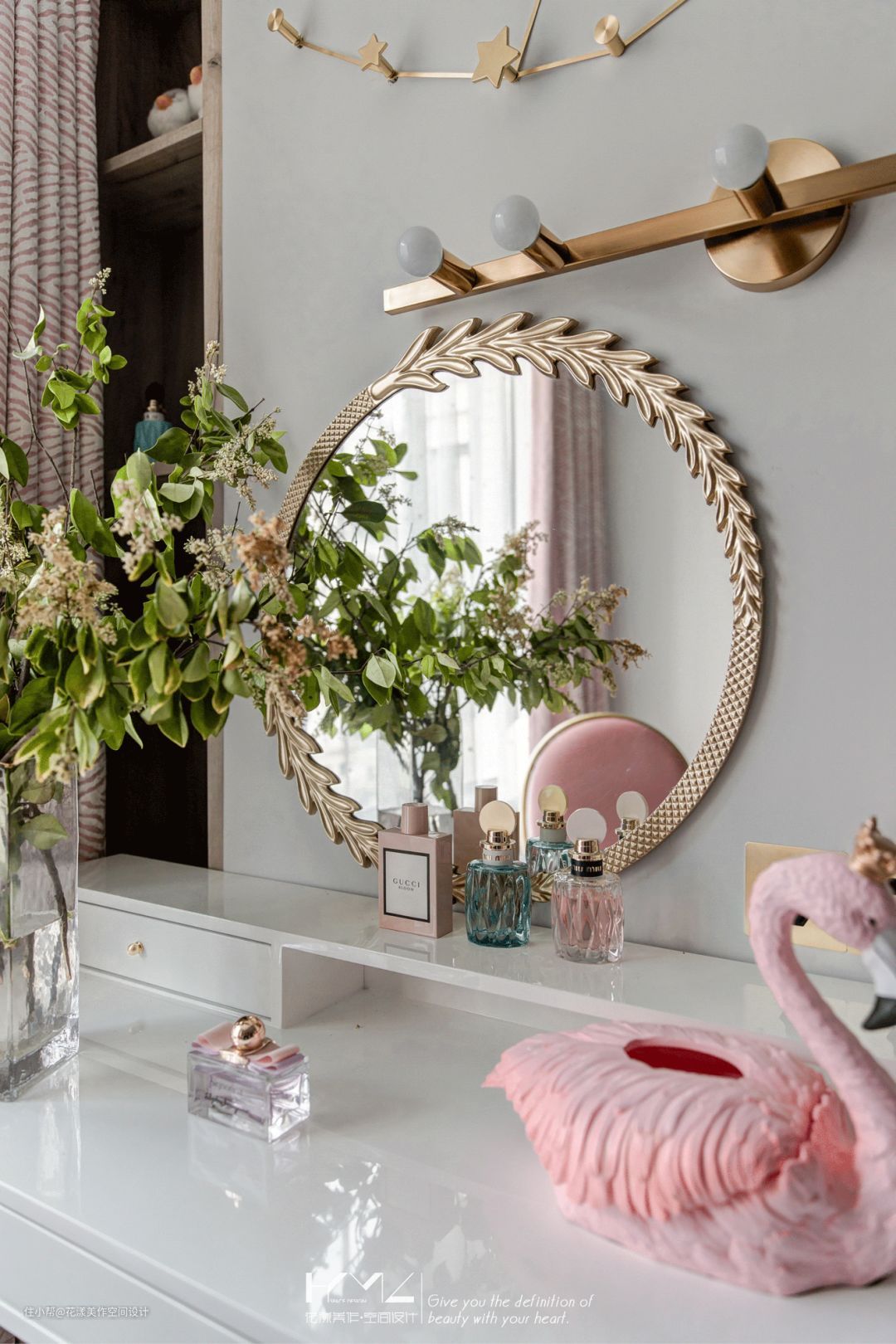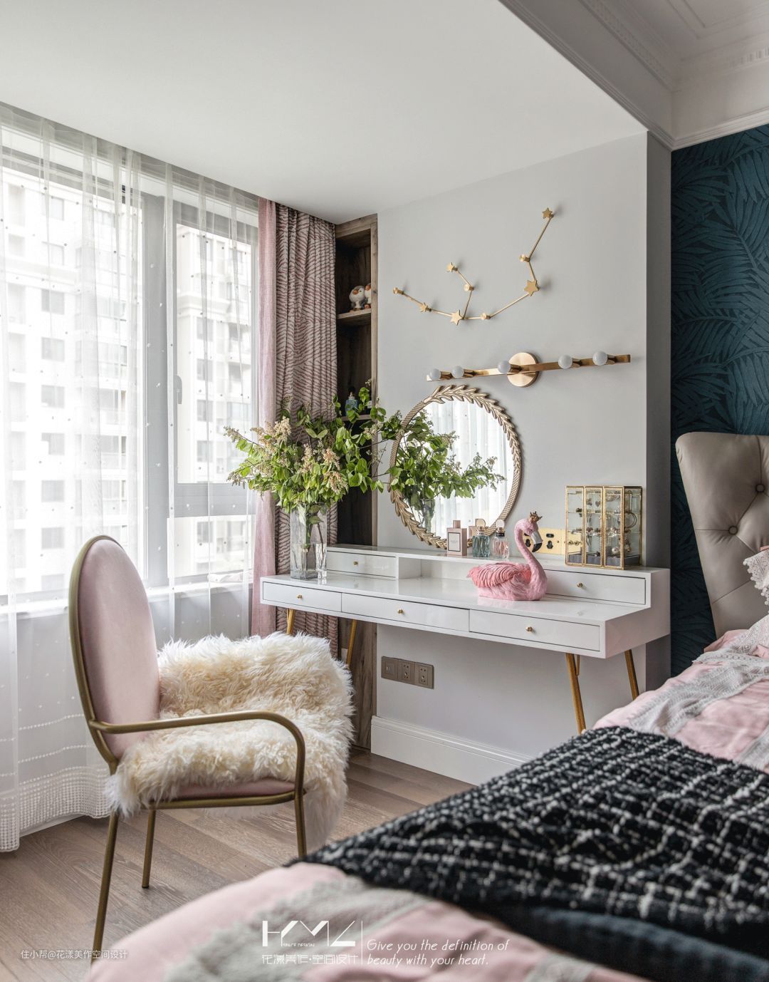 ▼妆台是我们女业主使用频率最高的地方,我们选配了1.4m双层收纳妆台。墙角内凹的空间,我们也利用起来做壁龛,可以给业主做美容产品的收纳空间,虎皮纹的粉色窗帘+波点装渐变的纱帘,粉色绒布高背化妆椅,绒毛坐垫舒适温暖的柔化了金属框的硬朗,除了美,还是美。