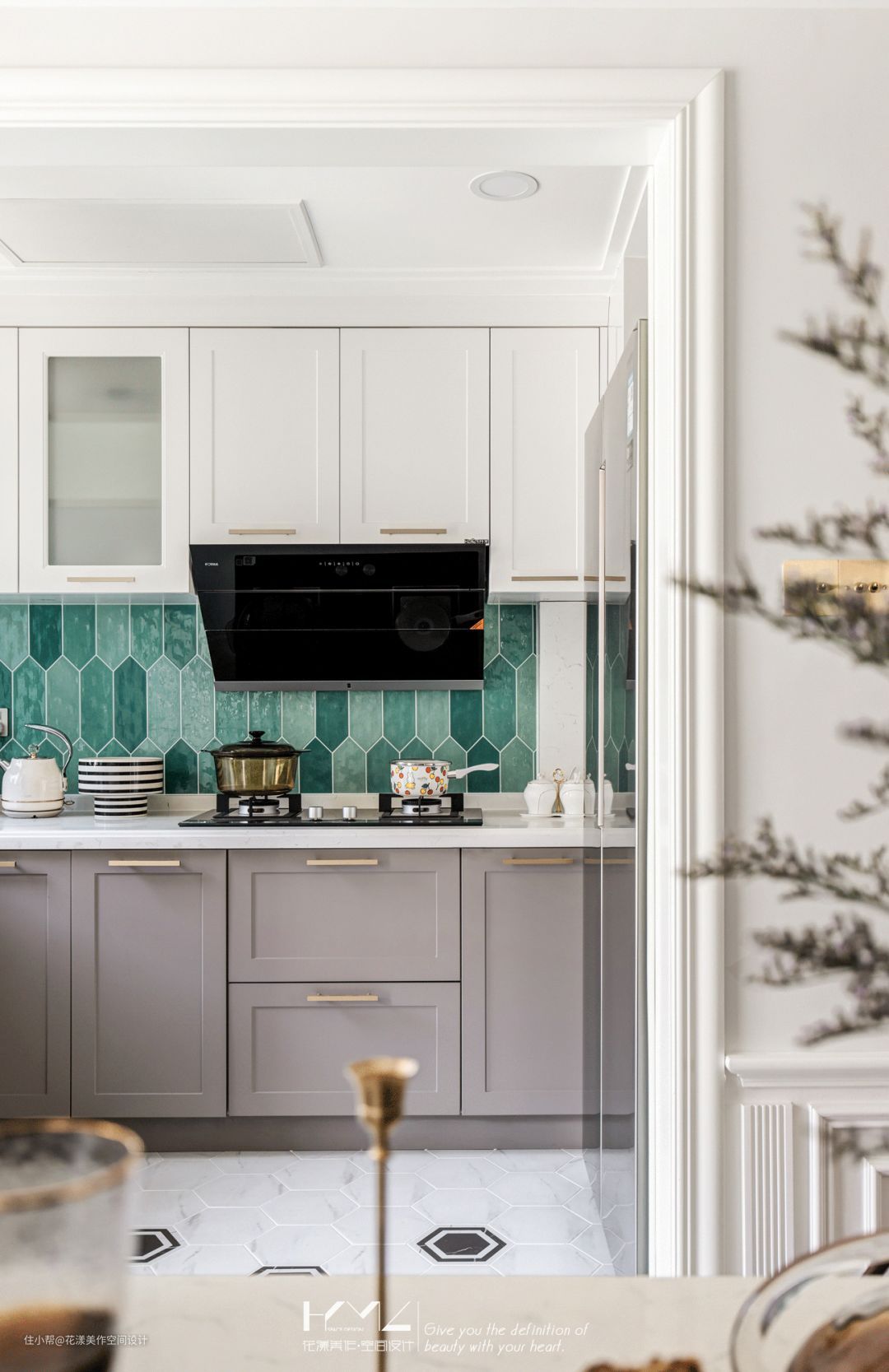 ▼厨房的设计重点在墙地砖和厨柜的搭配上,因为是半开放式的厨房,所以墙砖的选择上选用了三色混拼,与主卫砖的混的大小规格和砖的形状不一样,形式和主卫墙面做呼应。