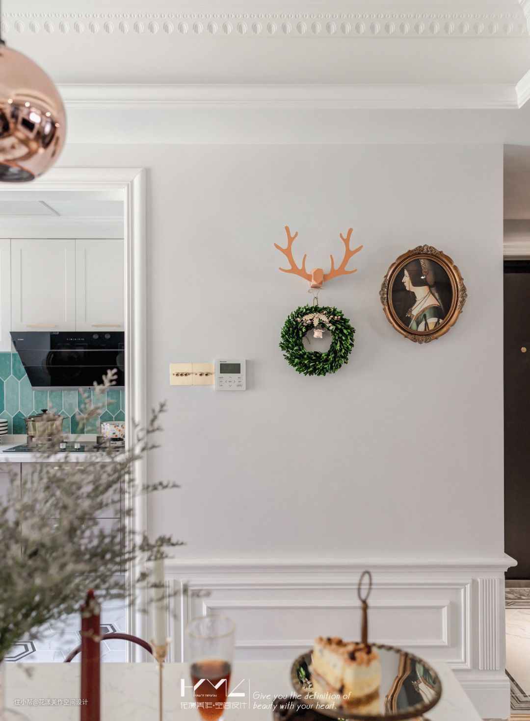 ▼这里原本是有个北阳台下水管,比较突兀,位置也不能改动,我们设计了罗马柱的样式来装饰包裹,让它成为了餐厅的一个小亮点。粉色圆盘与小花瓶结合的壁饰,用一株鲜花,就可以让餐厅变得生机勃勃。