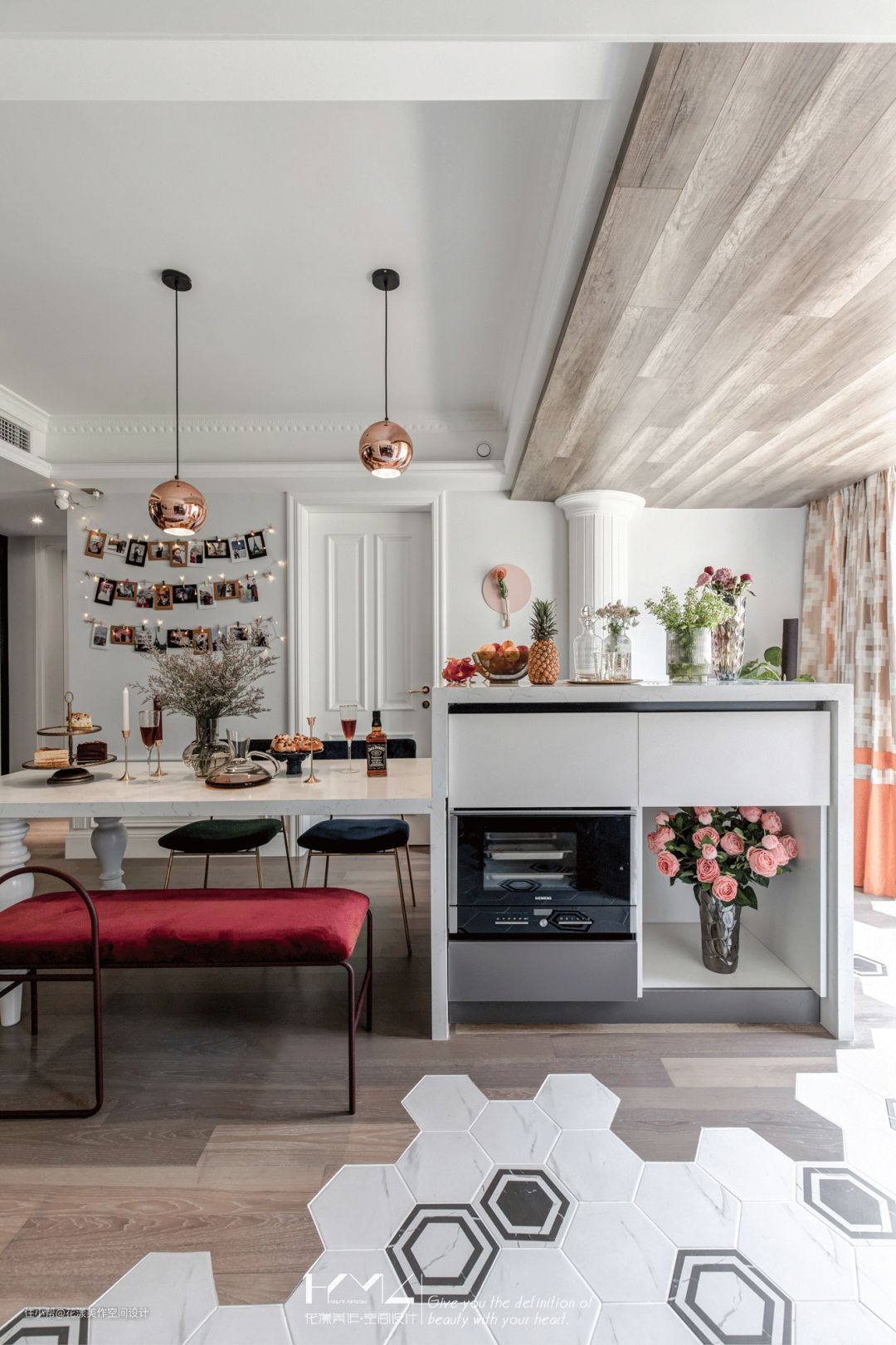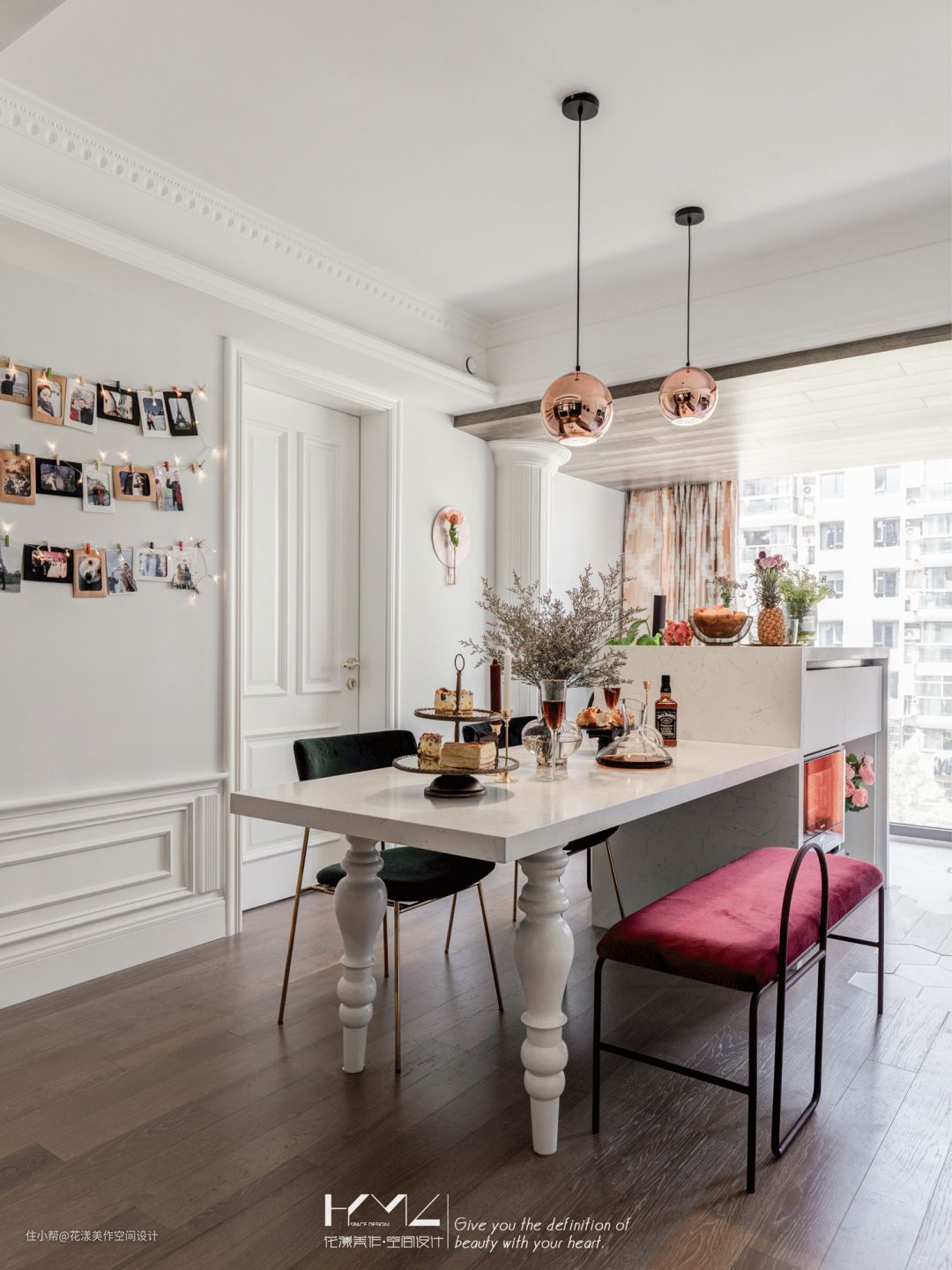 ▼餐桌台面与岛台进行一体化设计,餐桌和桌腿都是找厂家根据图纸定制的,造型憨厚可爱的罗马烤漆实木柱腿,带着一点点复古感,台面选用了白色的带纹理的石英石。