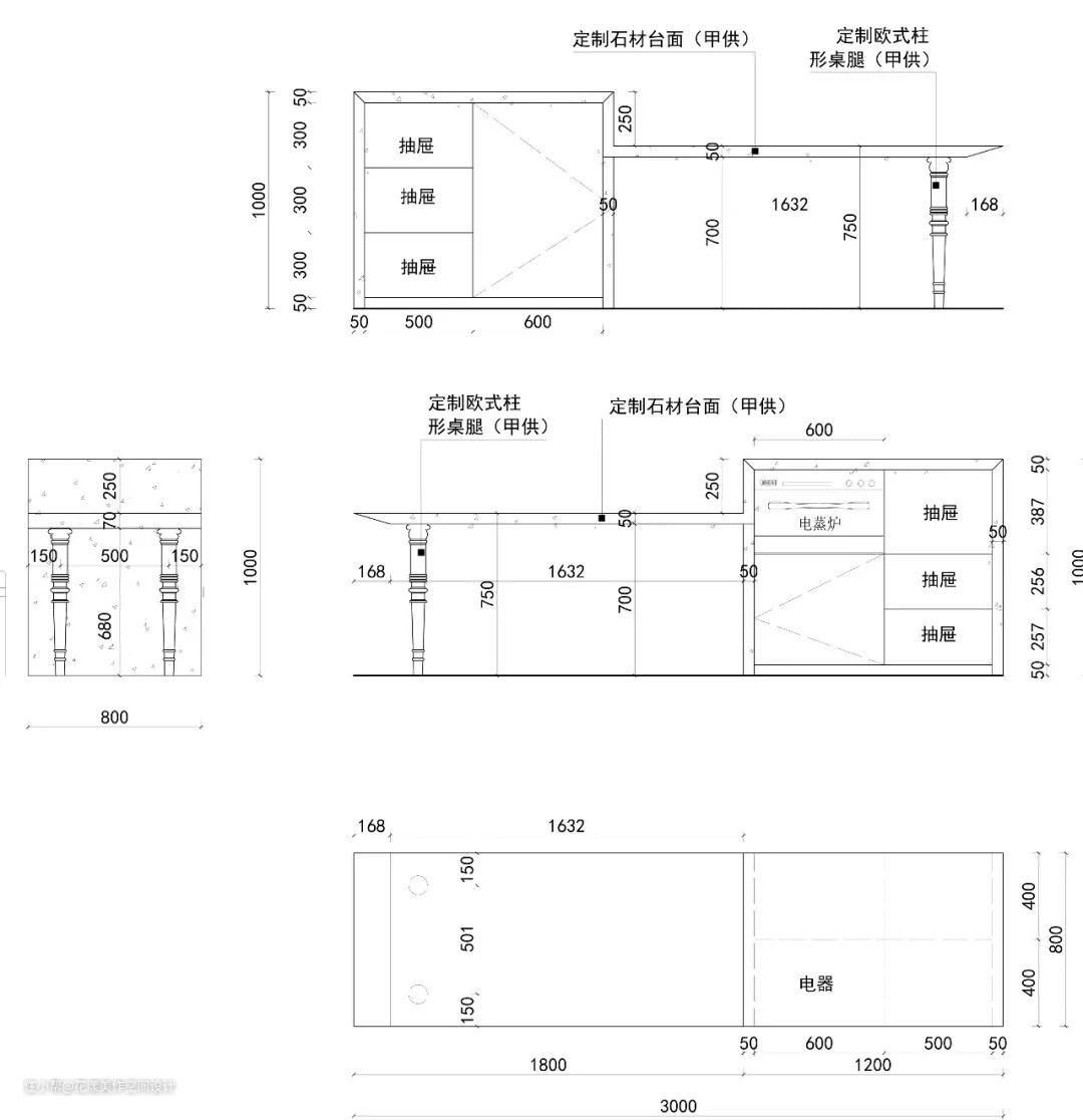 ▼这是岛台与餐桌的设计具体尺寸图纸,餐桌两边各预留了1m的过道空间。