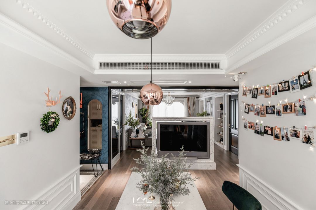 1、客厅面积比例偏大,正好利用这失衡的比例,我们取消了常规的电视背景墙,将电视机放置于客厅与餐厅之间的过道上,利用旋转架,让其可以360°自如转动,围绕电视机,形成了客餐厅的双环绕动线,增加了空间的灵动趣味性。