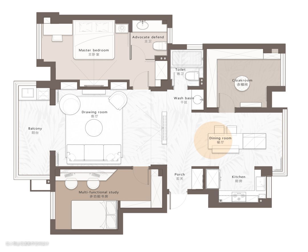 4、将采光比较弱的北卧改成大衣帽间,满足女业主的收纳需求,并将北卧房门调转方向,让出可观储物空间。