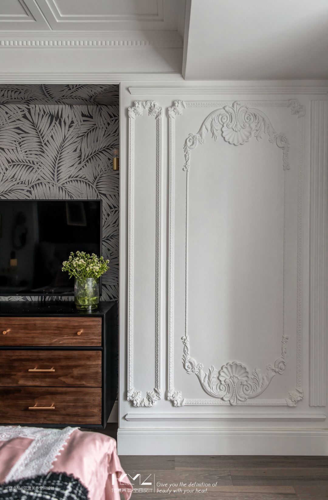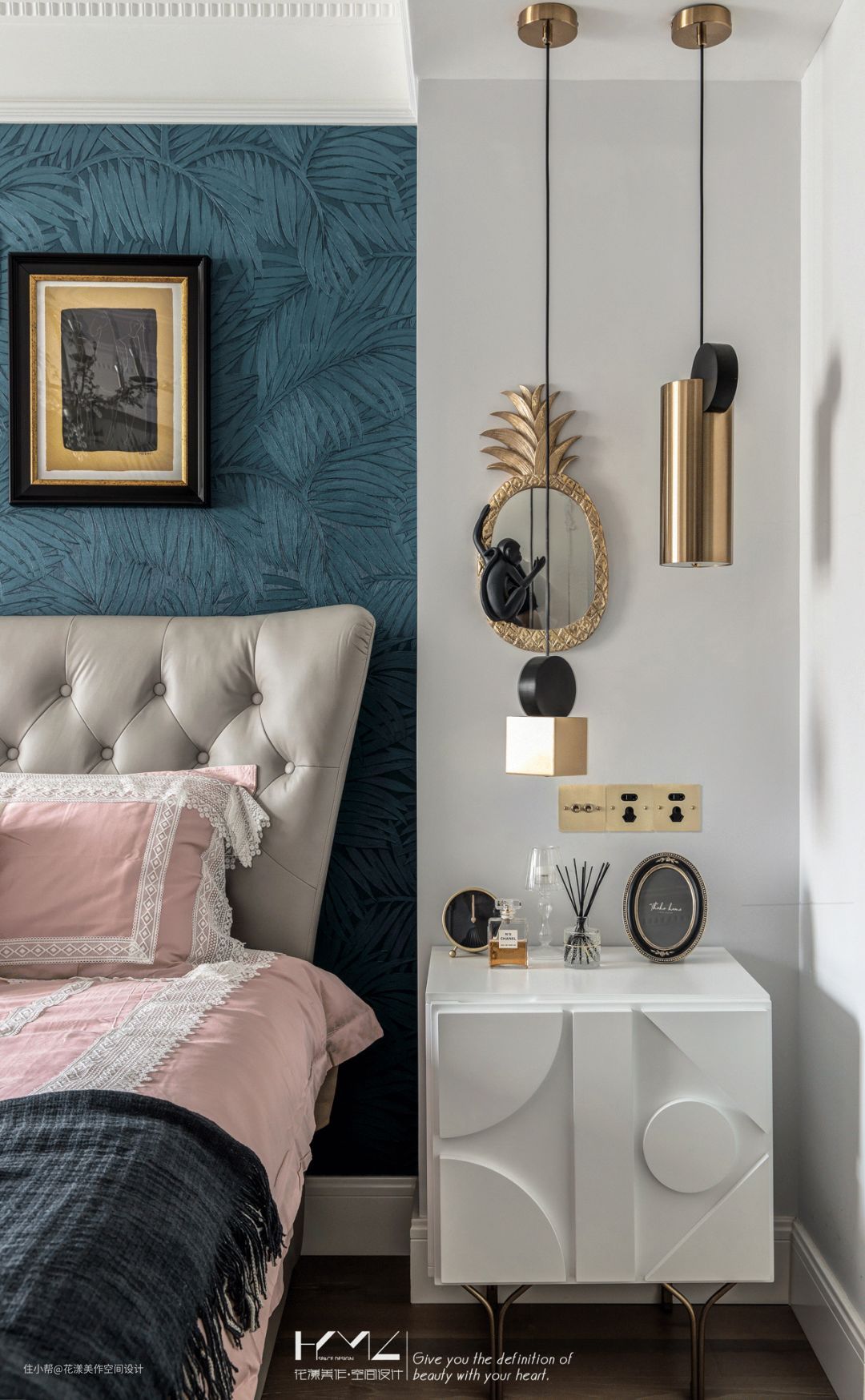 ▼床背景内嵌的壁纸,则与入户玄关呼应了起来,床头组合画有现代抽象的,也有复古精致的,还有业主自己的照片与金属挂框进行组合搭配,用心而又独特。
