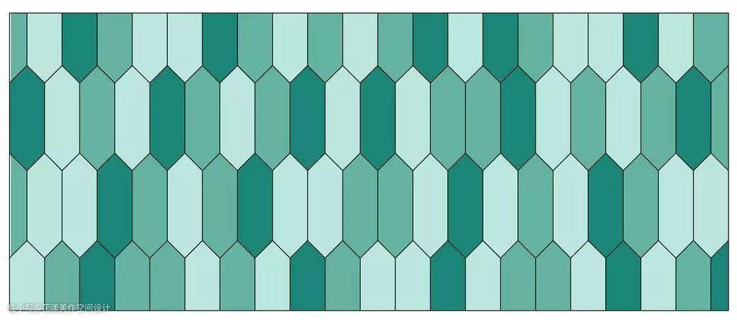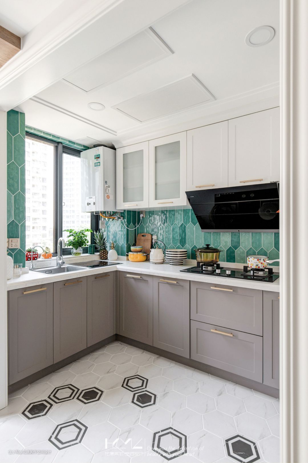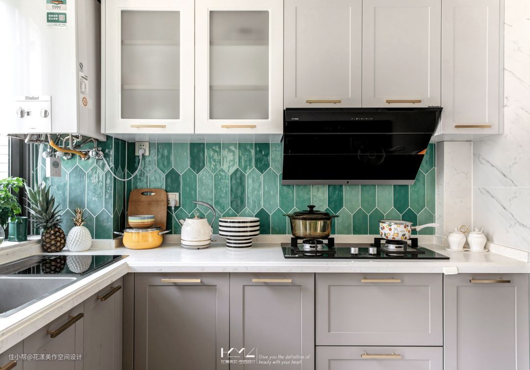 ▼厨房的设计重点在墙地砖和厨柜的搭配上,因为是半开放式的厨房,所以墙砖的选择上选用了三色混拼,与主卫砖的混的大小规格和砖的形状不一样,形式和主卫墙面做呼应。