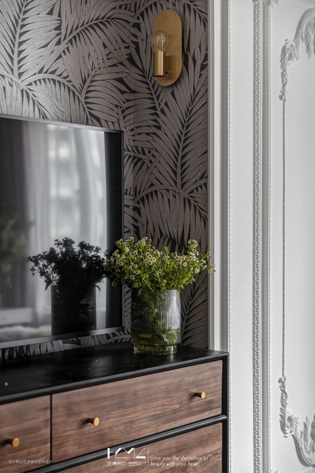▼电视柜则内置在与客厅连接的墙体中间,中间的壁纸则与我们沙发背景呼应,黄铜壁灯面对面装饰,胡桃木色的电视柜,无一处不体现设计师的用心搭配。