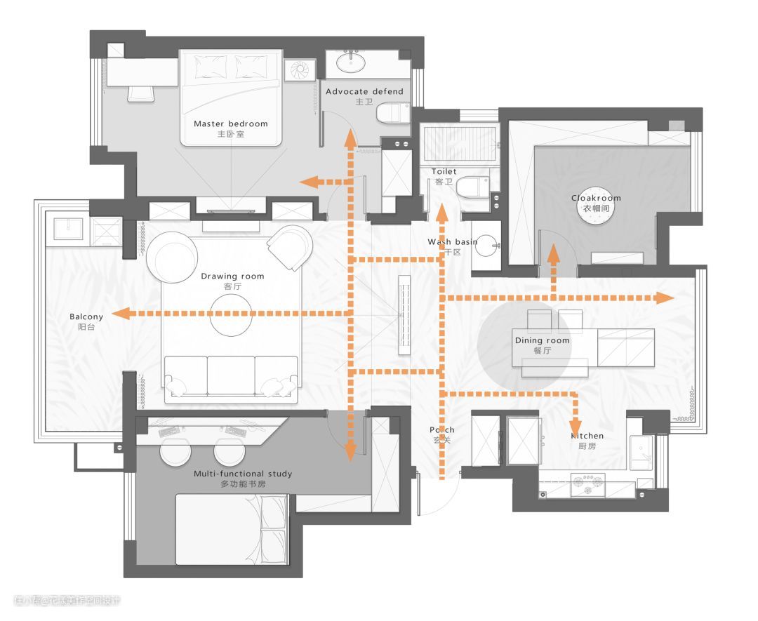 4、将采光比较弱的北卧改成大衣帽间,满足女业主的收纳需求,并将北卧房门调转方向,让出可观储物空间。