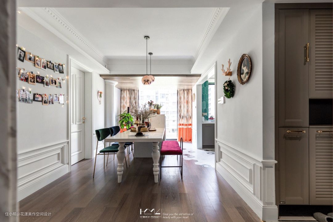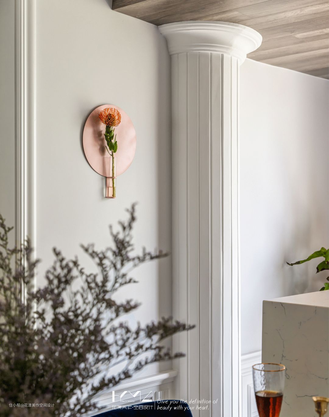 ▼这里原本是有个北阳台下水管,比较突兀,位置也不能改动,我们设计了罗马柱的样式来装饰包裹,让它成为了餐厅的一个小亮点。粉色圆盘与小花瓶结合的壁饰,用一株鲜花,就可以让餐厅变得生机勃勃。